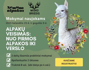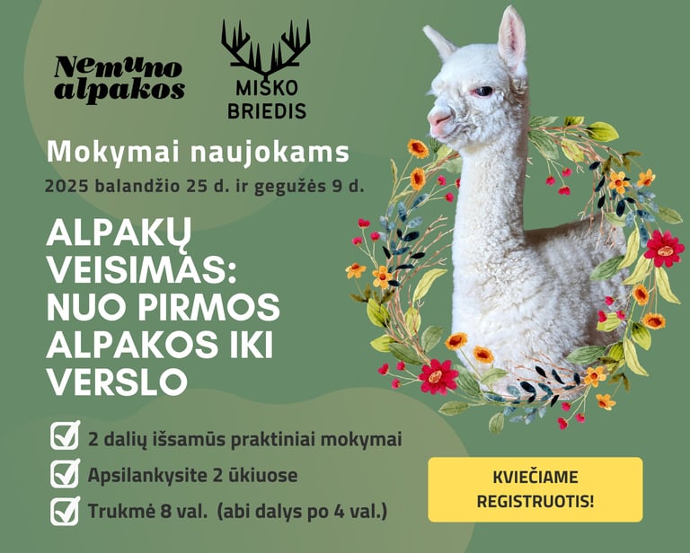 Balandžio 25 d. ir gegužės 09 d. Miško Briedžio ūkis kartu su Nemuno Alpakų ūkiu kviečia dalyvauti PRAKTINIUOSE mokymuose būsimiems/pradedantiesiems alpakų augintojams. Abi mokymų dalys vyks skirtinguose alpakų ūkiuose, tad galėsite susipažinti ir pabendrauti su keliais augintojais, pamatyti du ūkius, pačiupinėti dvigubai daugiau alpakų ir sužinoti viską apie alpakininkystę nuo A iki Ž.