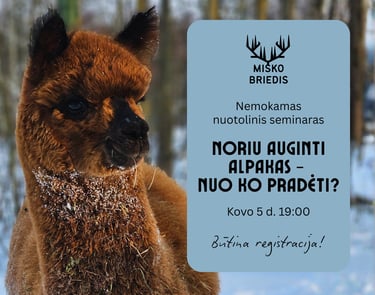 Kovo 5 d. 19:00 kviečiame visus, svarstančius apie alpakų auginimą, į nemokamą nuotolinį seminarą pradedantiesiems. Tai įvadinis seminaras, skirtas tiems, kurie nori susipažinti su alpakų augintojo kasdienybe ir įsivertinti, ar šis kelias būtent Jums. Seminaro metu aptarsime pagrindines alpakų charakteristikas, galimus auginimo tikslus, svarbiausius priežiūros aspektus, taip pat skirsime laiko dalyvių klausimams.