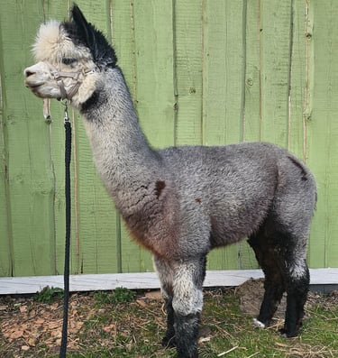 Jaunas, kilmingas alpakos patinas AS Peruvian Apache. Patinui šiuo metu yra 4m., sėkmingai pradėjęs kergimo karjerą: sulaukėme 4 šio patino jauniklių - 2 pilkų patelių, 1 rudo ir 1 kreminio patinukų. Rūkas čipuotas, paskiepytas, nukirmintas, stiprios sveikatos gyvūnas, proporcingo sudėjimo, švelnios, ypatingai gražios spalvos vilnos, labai gerai vaikšto su pavadėliu. Patinas registruotas Alpakų ir lamų augintojų asociacijos registre, yra kilmės sertifikatas, išsamus kilmės medis, abu tėvai kilę iš Šveicarijos. 2024 metų Lietuvos alpakų parodoje užėmė III vietą pilkos spalvos kategorijoje savo amžiaus grupėje, sertifikuotas kaip tinkamas veisti. 2023 metų alpakų vilnos parodoje užėmė III vietą pilkos spalvos savo amžiaus kategorijoje.