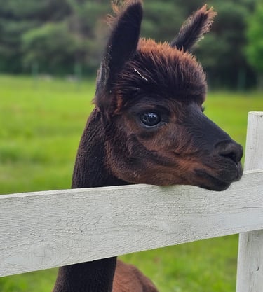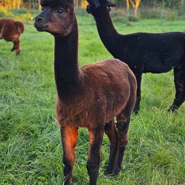 Mūsų ūkyje gimęs jaunas, tamsiai rudos spalvos patinėlis Griausmas. Čipuotas, paskiepytas, nukirmintas, stiprios sveikatos, taisyklingo, gražaus sudėjimo gyvūnas. Griausmas labai smalsus ir puikiai vaikšto su pavadėliu, greitai mokosi. Patinas registruotas Alpakų ir lamų augintojų asociacijos registre, yra kilmės sertifikatas, išsamus kilmės medis. 2024 metų Lietuvos alpakų parodoje užėmė III vietą rudos spalvos kategorijoje savo amžiaus grupėje, o pirmoji jo vilna užėmė I vietą jauniausių rudų alpakiukų klasėje.