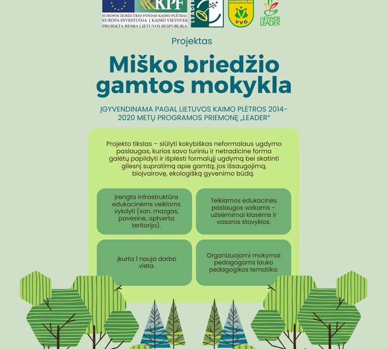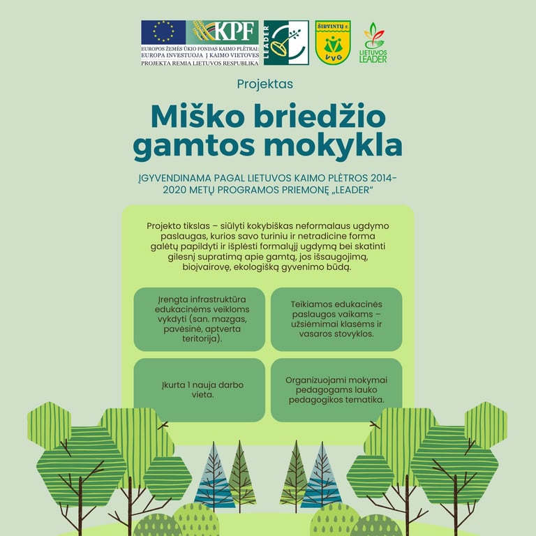 Šio projekto pagrindinis tikslas – sukurti ir siūlyti kokybiškas neformalaus ugdymo paslaugas, kurios savo turiniu ir netradicine forma galėtų papildyti ir išplėsti formalųjį ugdymą bei skatinti gilesnį supratimą apie gamtą, jos išsaugojimą, bioįvairovę, ekologišką gyvenimo būdą.